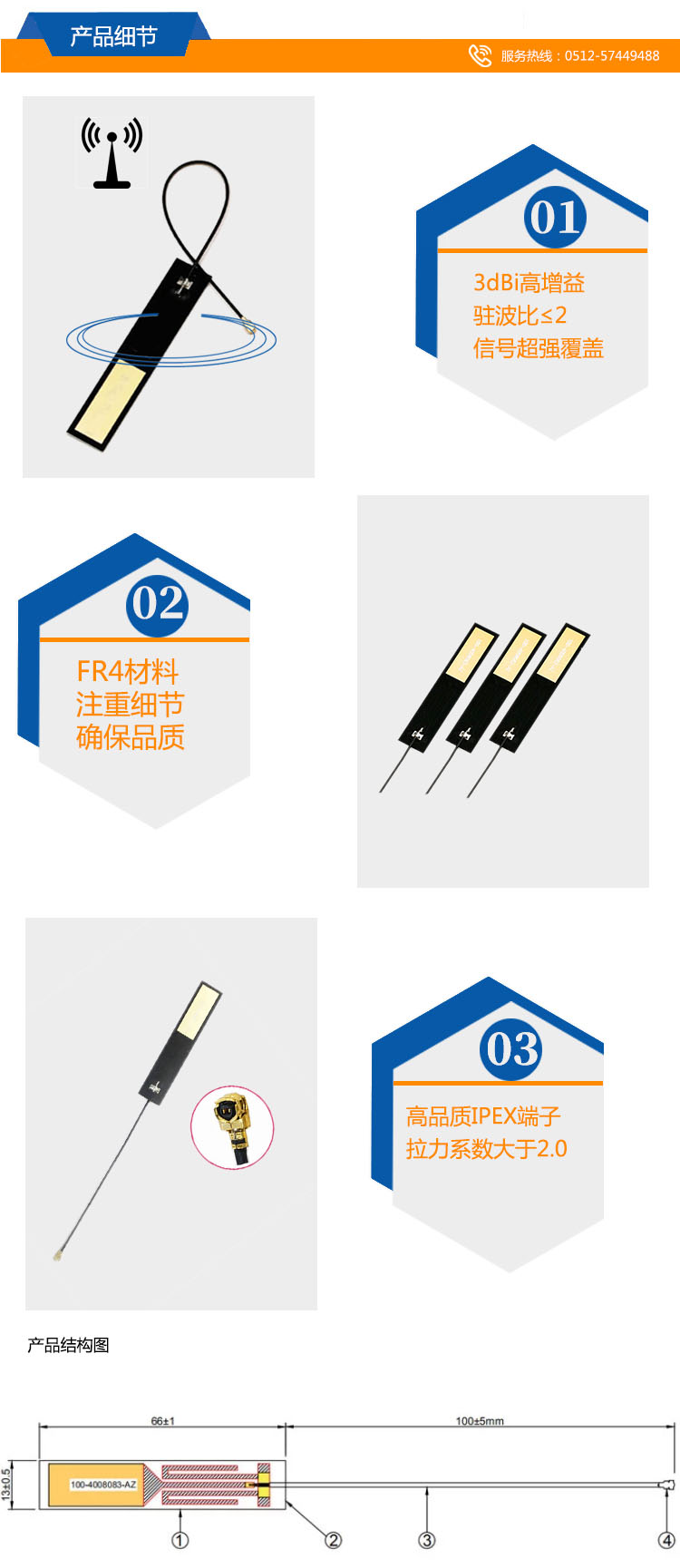 2:尺寸:66*13mm 3:IPEX 4:RF1.13線材,線長可定制" />