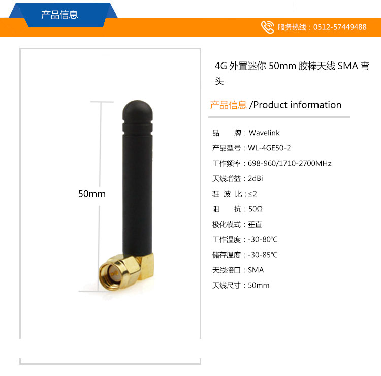其他規(guī)格-頻率:698-2700 MHz。帶寬:20 MHz。增益:2.5 dBi。極化:垂直。最大額定功率:50W。阻抗:50歐姆。接頭類型:SMA,天線長(zhǎng)度:50毫米