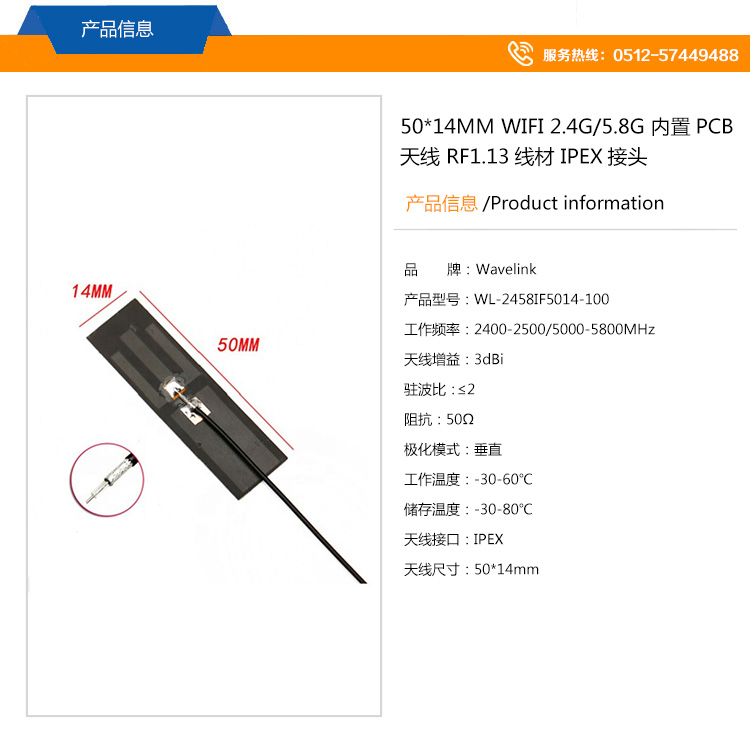 50*14MM WIFI 2.4G/5.8G雙頻 內(nèi)置FPC 天線 RF1.13線材 IPEX接頭