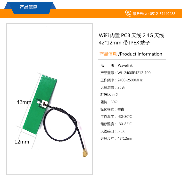 42*12mm WiFi內(nèi)置天線 雙頻PCB天線 2.4G/5.8G天線 IPEX接頭