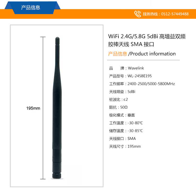 5dBi 2.4G 5.8G 雙頻WiFi 高增益棒狀天線 195mm 帶SMA轉(zhuǎn)IPEX連接線