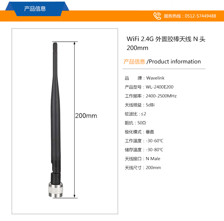 WiFi 2.4G 外置膠棒天線 N頭 長200mm