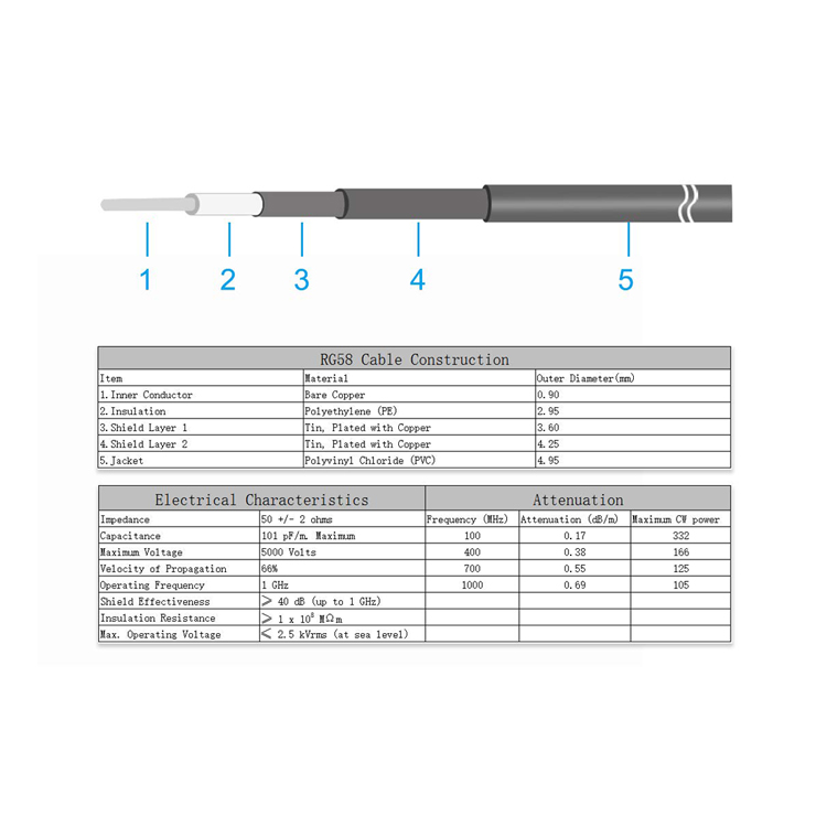 RG58/U 額定為 50 歐姆低阻抗同軸電纜,95% 編織覆蓋率