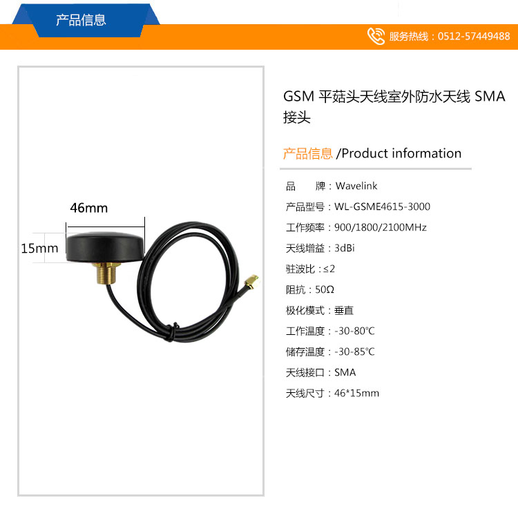 頻率范圍:900/1800/2100MHz 駐波比≤2 天線增益:3dbi 阻抗:50Ω 天線尺寸:46*15mm 線材長度:3米(可定制) 接口:SMA內針(可定制) 工作溫度:-40℃-+85℃ 儲存溫度:-40℃-+85℃