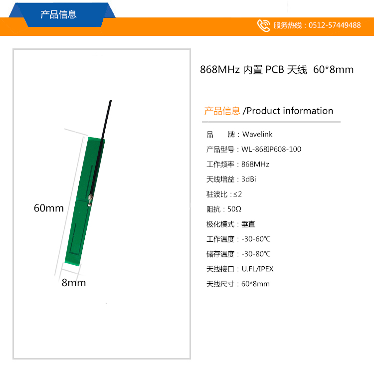 868MHz 低損耗內(nèi)置PCB天線 60*8 IPEX接頭